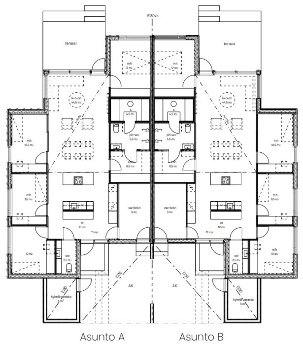 Arkkitehtitoimisto Saika Designin suunnittelemassa paritalossa pohjaratkaisu on suunniteltu sujuvaan arkeen ja perheen tarpeisiin. Tilat ovat avarat ja valoisat, ja neliöt on sijoitettu käytännöllisesti ilman hukkaneliöitä. Yksitasoinen ratkaisu, suuri terassi sekä lämpimät ja kylmät varastot tuovat joustavuutta arkeen ja mahdollistavat monipuolisen asumisen. Oma piha ja rauhallinen ympäristö lisäävät asumisen mukavuutta. Sujuva arki jatkuu myös keittiön, kylpyhuoneen ja teknisten ratkaisujen kuten kaukolämmön ja lattialämmityksen ansiosta.